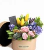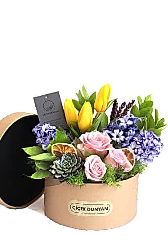 Mana Çiçek Dünyam Dizayn Ekibi Tarafından Yuvarlak Kraft Kutu Üzerine Mor Sümbül,Sarı Lale Ve Pembe Güller İle Tasarlanmıştır.Sevdiklerinizin Yüzünü Güldürebilmenin En Doğru Adresi Çiçek Dünyam İle Unutamayacağınız Anlar Ve Anılar Biriktirmeye Ne Dersiniz?