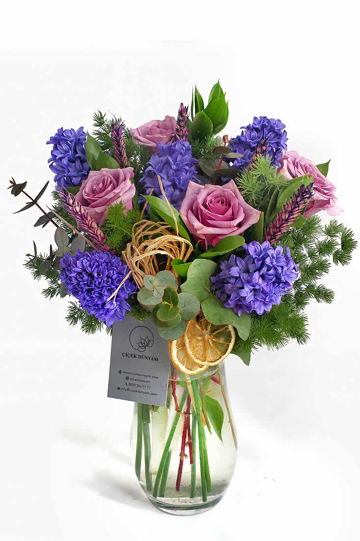 Mis Gibi Kokulu Sümbüller Eşliğinde Sunulmuş Lila Güller Renkleri İtibari İle Oldukça Göz Alıcı Ve Dikkat Çekicidir.Sevdiklerinizin Kalbini Ve Gönlünü Doyuracak Olan Bu Şık Tasarım Ayrıca Kokusu İle'de Alıcıyı Büyüleyecektir.Mor Renginin Anlamı Hayal Gücü Ve Maneviyattır.Lila Renginin Anlamı İse Ulaşılması Zor Bir Renk Olduğu İçin Eski Zamanlardan Beri Soyluların Rengi Olarak Bilinmektedir. Şimdi Sizde Sevdiklerinize Anlam Dolu Renkler İle Hazırlanmış Olan Arajmanı Sunabilir Ve Gününü Güzelleştirp Taçlandırabilirsiniz.